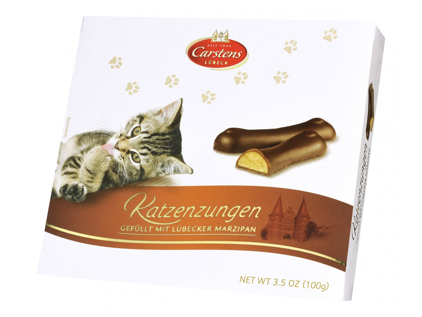 Kočičí jazýčky z jemného lubeckého marcipánu, v hořké čokoládě. Hmotnost 100 g. Rozměr bonboniéry: délka 17cm x šířka 15cm x výška 2cm.