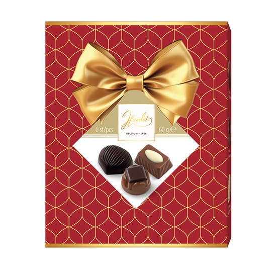 Kvalitní směs belgických pralinek v pěkné krabičce s natištěnou zlatou mašlí.